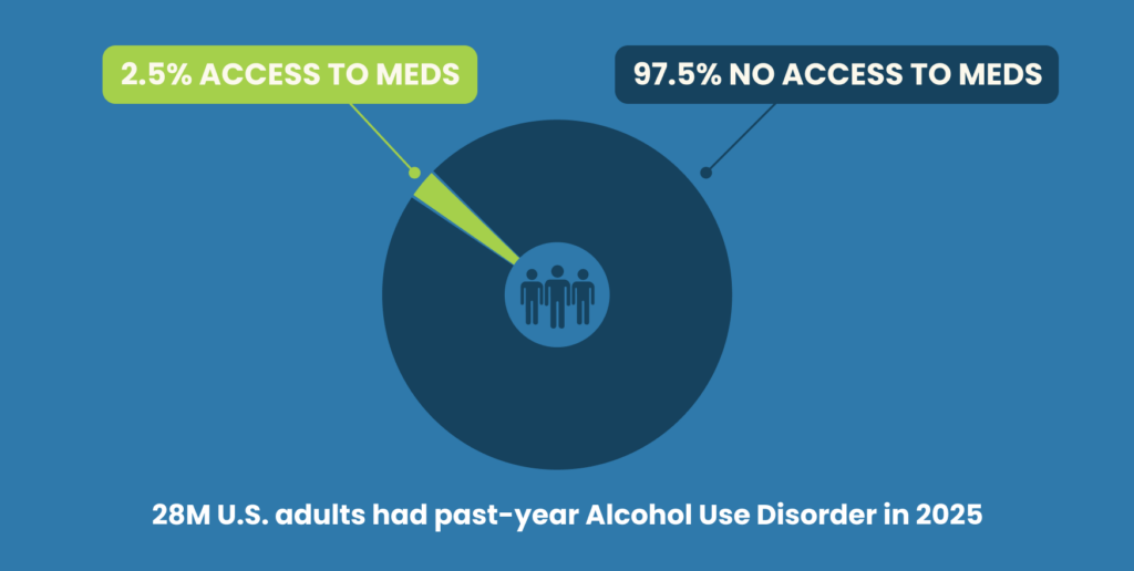 The evidence to this effect is clear. Of the 28M individuals with past-year alcohol use disorder, less than 3% were prescribed medication to address the biochemical side of their dependence.