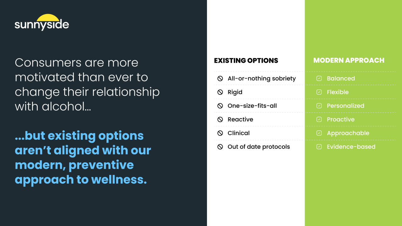 Sunnyside is not designed to treat alcohol use disorder (AUD). For resources related to AUD, including how to get support, please visit the NIH website. We’ve also partnered with Moderation Management, a non-profit dedicated to reducing the harm caused by the misuse of alcohol.