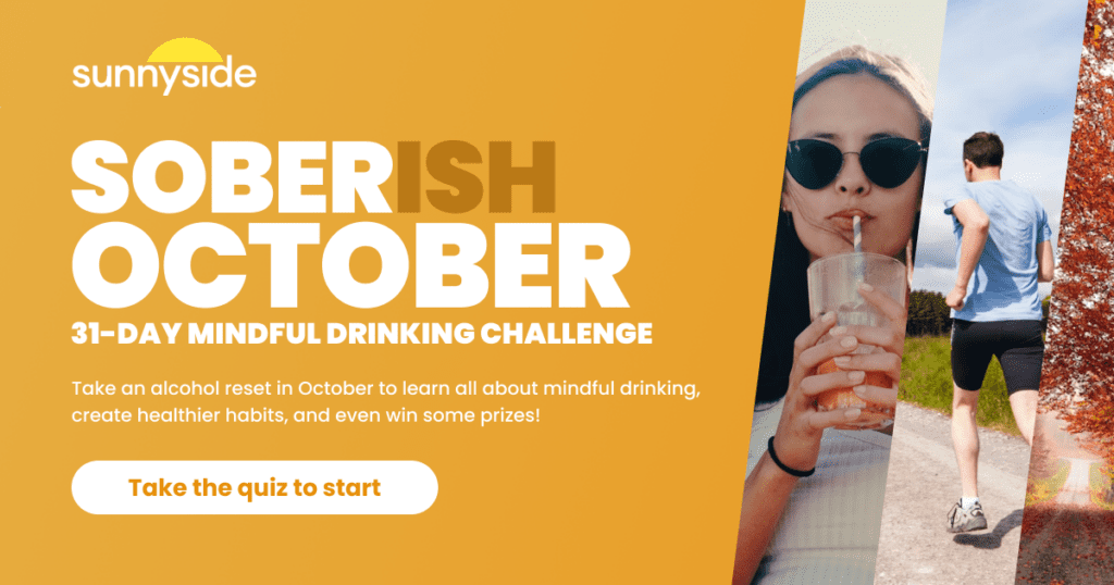 There are numerous resources available to support you through Soberish October. Books and podcasts about mindful drinking can offer guidance and inspiration. Here at Sunnyside we have accessibility to live coaches, community sharing to discuss and support yourself and others in app and plenty of like-minded people across our social platforms.If you haven’t stumbled across our Podcast, you’d be thrilled to know there’s info about almost every topic around drinking, and we’re always making more!